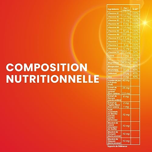 12 VITAMINES, 7 MINERAUX. – Les vitamines B1, B2, B3, B5, B6, B8, B12, C, le Fer, le Magnésium contribuent à un métabolisme énergétique normal. – Les vitamines B2, B3, B5, B6, B9, B12, C, le Fer, le Magnésium contribuent à réduire la fatigue.
