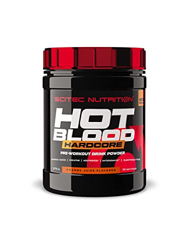 Spécification: Scitec Nutrition Hot Blood Hardcore, Poudre de boisson pré-entraînement avec acides aminés et créatine, 375 g, Juice d’orange