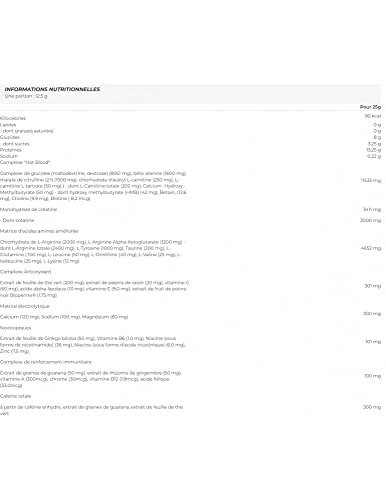 WITH CREATINE MONOHYDRATE: The creatine in HOT BLOOD HARDCORE enhances physical performance during short bursts of high intensity exercise. The beneficial effect is achieved with a daily intake of 3 g of creatine.