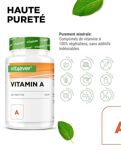Spécification: Vitamine A – 10.000 I.U. (3000 µg) – 365 comprimés – Alternative aux gélules – Acétate de rétinyle hautement dosé – Sans additifs indésirables – Yeux, peau, système immunitaire – Vegan