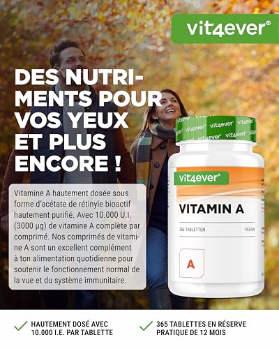 Vitamine A – 10.000 I.U. (3000 µg) – 365 comprimés – Alternative aux gélules – Acétate de rétinyle hautement dosé – Sans additifs indésirables – Yeux, peau, système immunitaire – Vegan