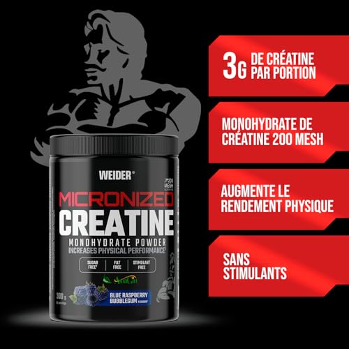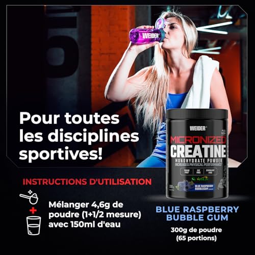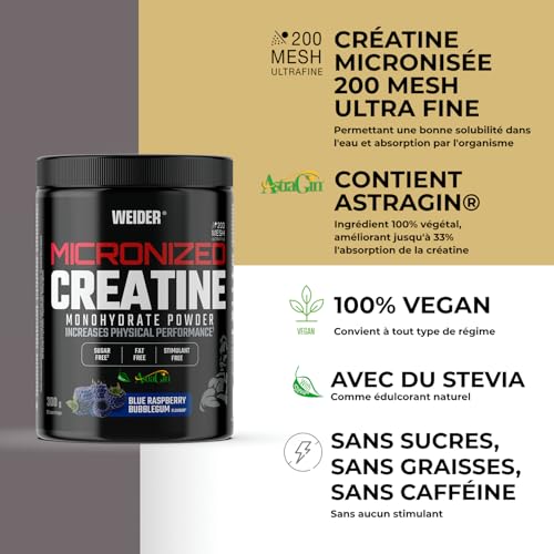 Spécification: Weider Micronized Creatine Monohydrate Powder (300g) Goût Chewing-gum Framboise. Poudre de Créatine Monohydrate 200 Mesh Ultrafine avec AstraGin, Stevia, Vegan, Augmente la Performance Physique